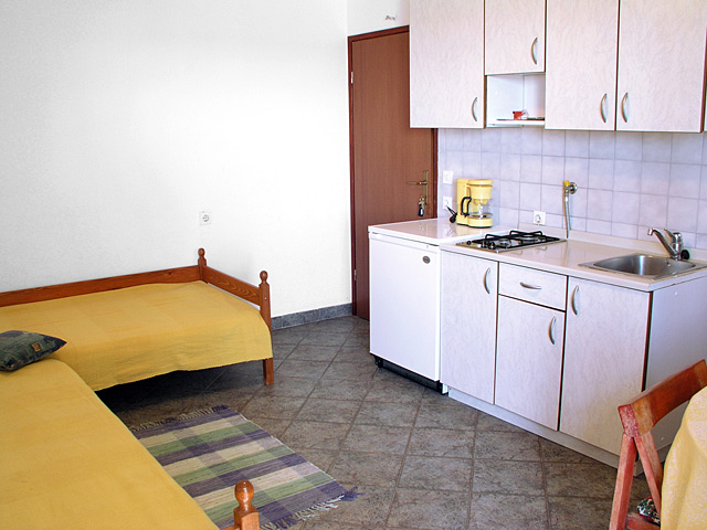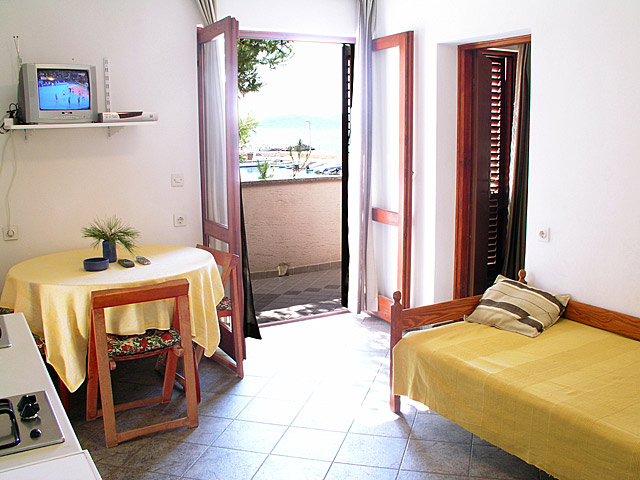 The apartment has a partially shaded balcony (7x1.5m) with a view of the sea which you can exit to from the living room and the sleeping room.